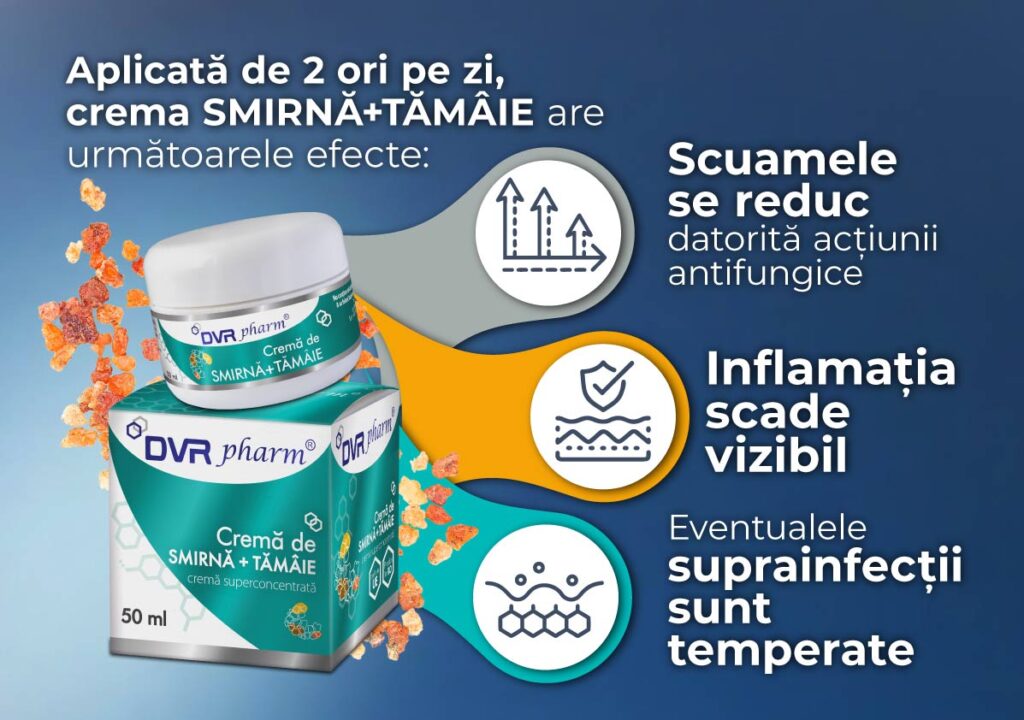 Crema cu smirnă și tămâie e un aliat natural împotriva inflamației, fungilor și bacteriilor patogene. Din vechime, smirna era folosită pentru răni și infecții, iar tămâia pentru dermatite și inflamații.